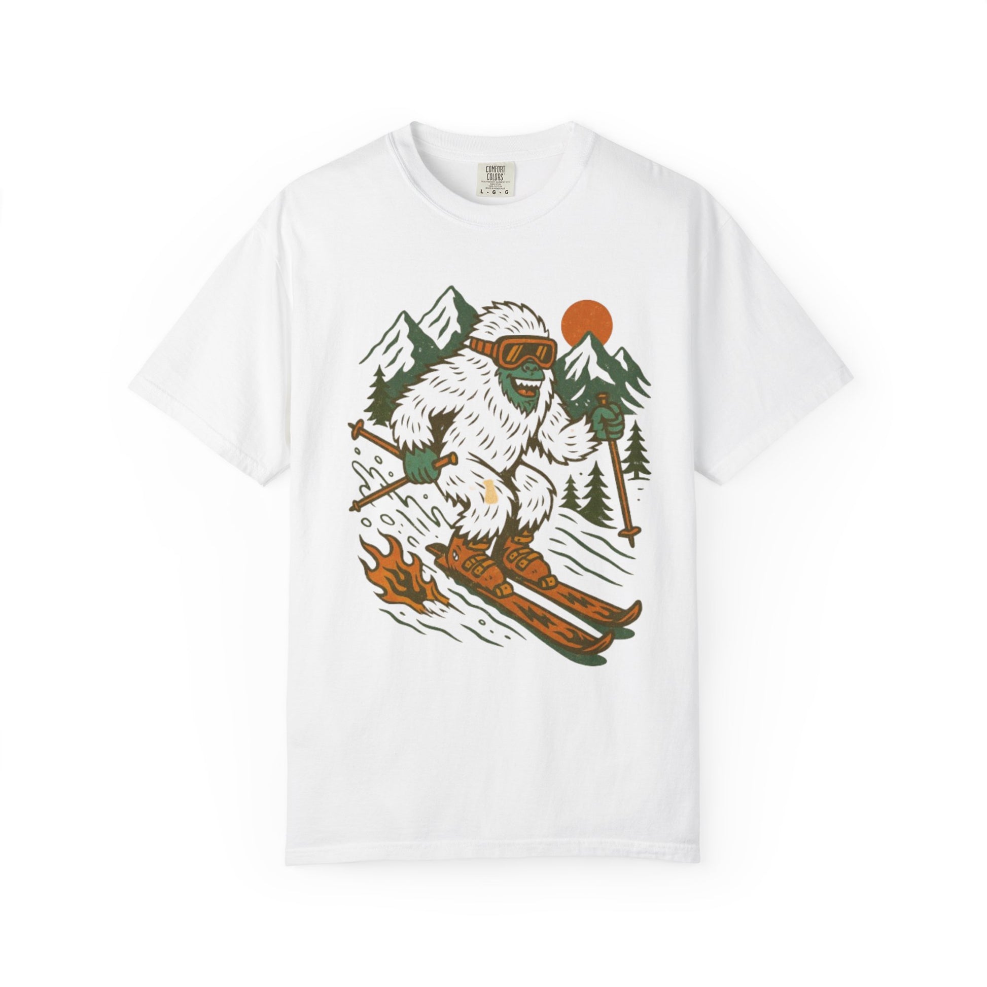 Feel the thrill of yeti skiing with this unique and fun design on a garment-dyed T-shirt. Perfect for adventurous individuals looking to add a touch of whimsy to their wardrobe. Ideal for outdoor enthusiasts and winter sports lovers. Great for winter holidays, skiing trips, and casual everyday wear.